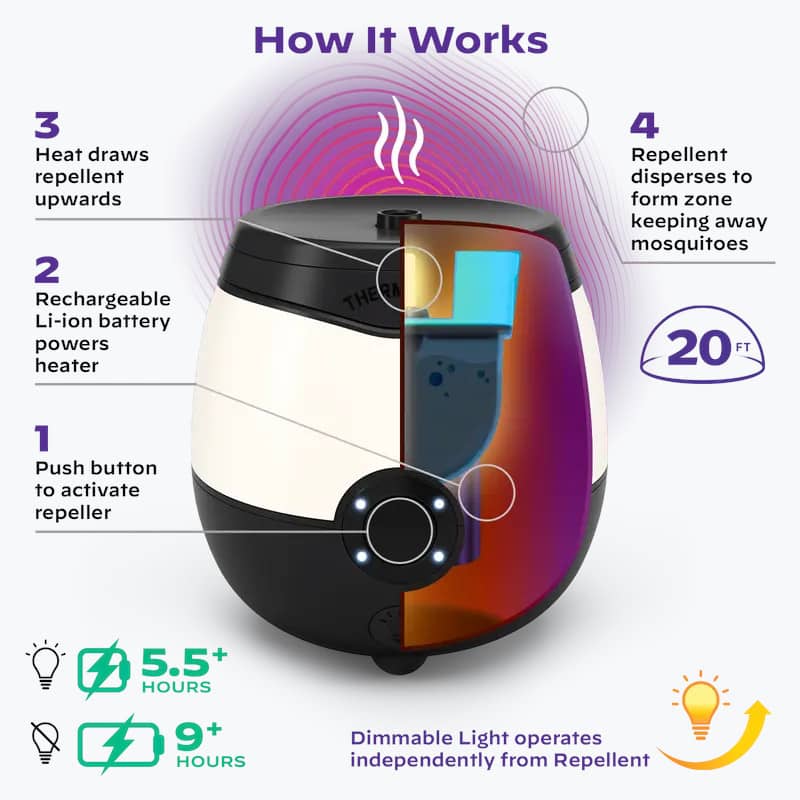 • Heat-activated technology: Powered by a rechargeable Li-ion battery, with up to 9 hours of mosquito protection when using only repeller; up to 5.5 hours when also using light. The light operates independently from repeller.